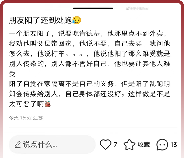 例如有人在社交平台举报自己的朋友,说朋友阳了之后想吃肯德基,点不到外卖非要打车去买,还声称“我阳了就是别人传染的,别人都管不好自己,我也要让别人难受。”
