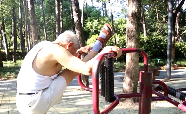 疫情期间,只要小区没有封控,郦德火每天都会准时准点地去公园锻炼,压腿、引体向上,他都能轻松自如的完成。
