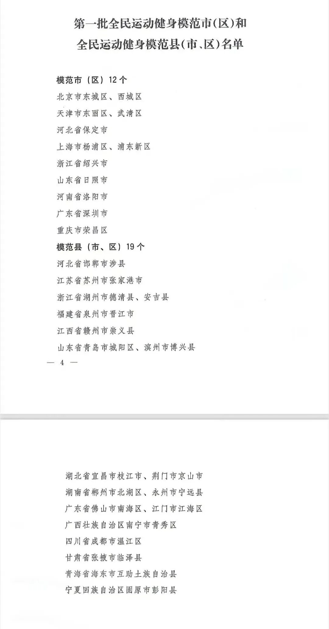 近日,国家体育总局发布第一批全民运动健身模范市(区)和全民运动健身模范县(市、区)名单。