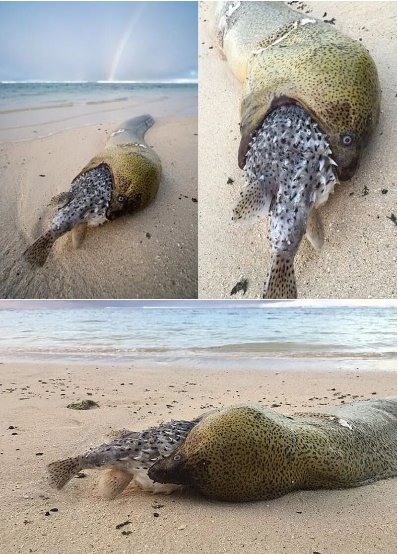 这条贪婪的鳗鱼试图吞下一只正在嘴里膨胀的河豚,最终导致窒息而亡,最终双双葬身沙滩…