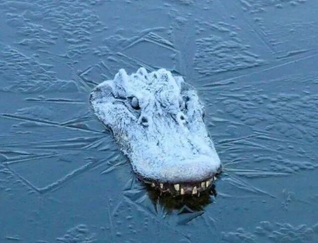在冰湖中冬眠的短吻鳄,水线之上只露出了一点点头部,而且似乎眼睛还是睁着的…