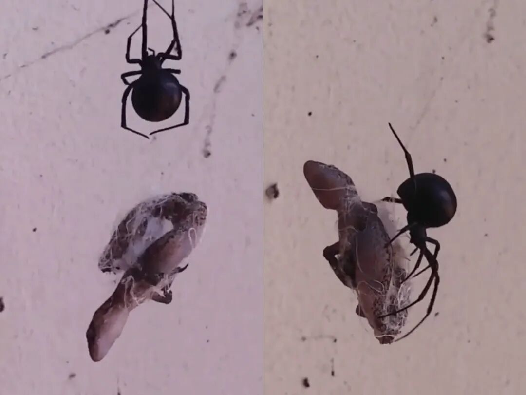 一只壁虎成了红背蜘蛛的盘中餐…这种来自澳大利亚的食肉性蜘蛛,是澳大利亚最毒的两种蜘蛛之一,甚至还出现过捕食眼镜蛇的案例…