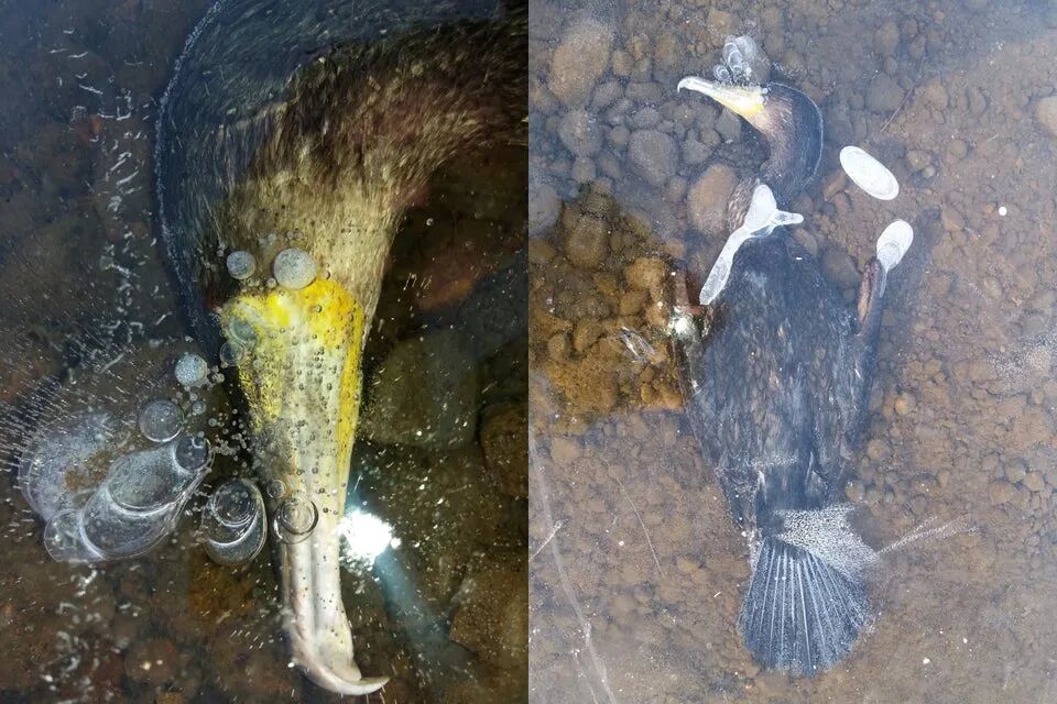 被冻结在水下鸬鹚,和它的最后一口气…鸬鹚会在结冰的湖泊或者池塘中潜水捕捉鱼类,但有时候也会有去无回…