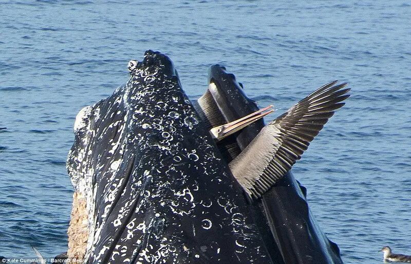 一只鹈鹕在座头鲸群捕鱼的时候,想要分一杯羹,妄图从鲸鱼嘴里夺食,没想到迟了一步,这就是贪婪的代价吧…