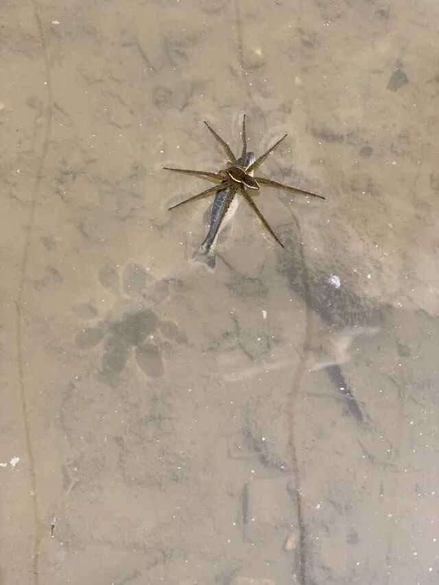 拖着一条鱼,在水面上行走的巨大蜘蛛…这种蜘蛛名叫六斑捕鱼蛛,能够捕食比它体型大五倍的猎物!