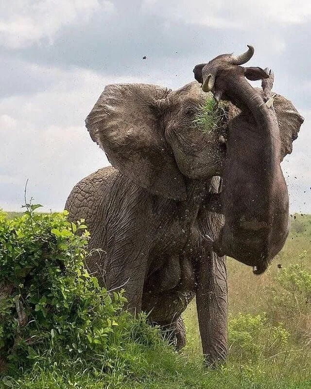 成年大象在自然界中绝对是无敌的存在,去招惹它的后果很严重,比如这头被大象用牙齿刺穿并挂在空中的水牛…