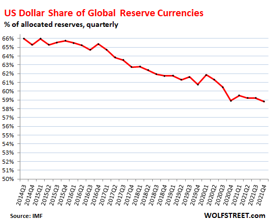 据SWIFT在4月公布的数据,美元在3月份的全球使用量虽仍稳居榜首,但市场份额已经从2020年时的43.5%跌至41.07%(今年1月时更是跌至39.9%),IMF在3月份发布的报告也显示美元在各国外储中的份额在2021第四季度意外下降至26年以来最低值至59.32%,请注意,2014年时该比例曾高达66%(具体数据细节请参考下图)。我们注意到,这种情况在2008年次贷危机后罕见。