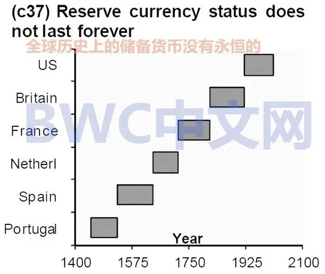 无独有偶,对全球货币和石油有着深刻见地的基辛格博士数周前还曾作出“如果美国倒下了,谁也别想好过”这一阐述,而通过日本、以色列、沙特都开始正式去美元化的现象上来看,这一阐述似乎不合时宜了。亦如下图所示,全球储备货币,从来就没有被某种单一的货币独占过。