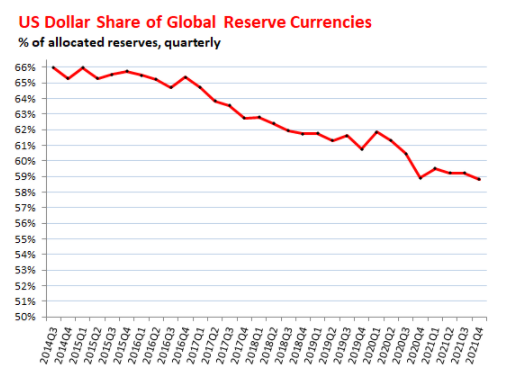 综上所述,当日本,以色列,沙特三个与美国经济有着较为特殊联系的国家开始正式去美元化时,全球去美元化则相当于掀起了高潮。而如下图示,据IMF最新公布报告显示,美元在国际储备中的份额已经从上世纪70年代最高的85%跌至目前的仅有58%。显而易见的是,美元的储备份额正在进入下坡通道。