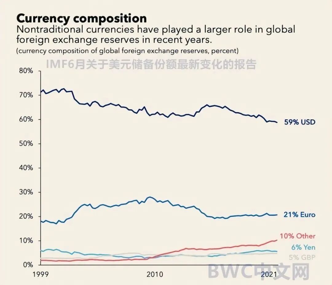 综上所述,当日本,以色列、沙特三个与美国经济有着较为特殊联系的国家,以及瑞士这一中立国都开始正式去美元化时,全球去美元化则相当于掀起了高潮。而如下图示,据IMF最新公布报告显示,美元在国际储备中的份额已经从上世纪70年代最高的85%跌至目前的仅有58%。显然,美元的储备份额正在进入下坡通道。