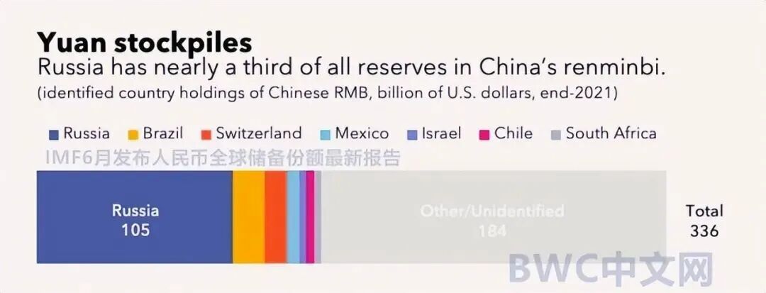 第二件事情是,IMF(国际货币基金组织)6月1日最新报告显示, 人民币在全球储备中的份额有所增长,人民币储备份额占近年来从美元储备份额转移出来的25%。通过下图,可以看到,俄罗斯、巴西、瑞士、以色列、智利、南非至少6国都在增加人民币储备,进而替代之前的部分美元储备份额。