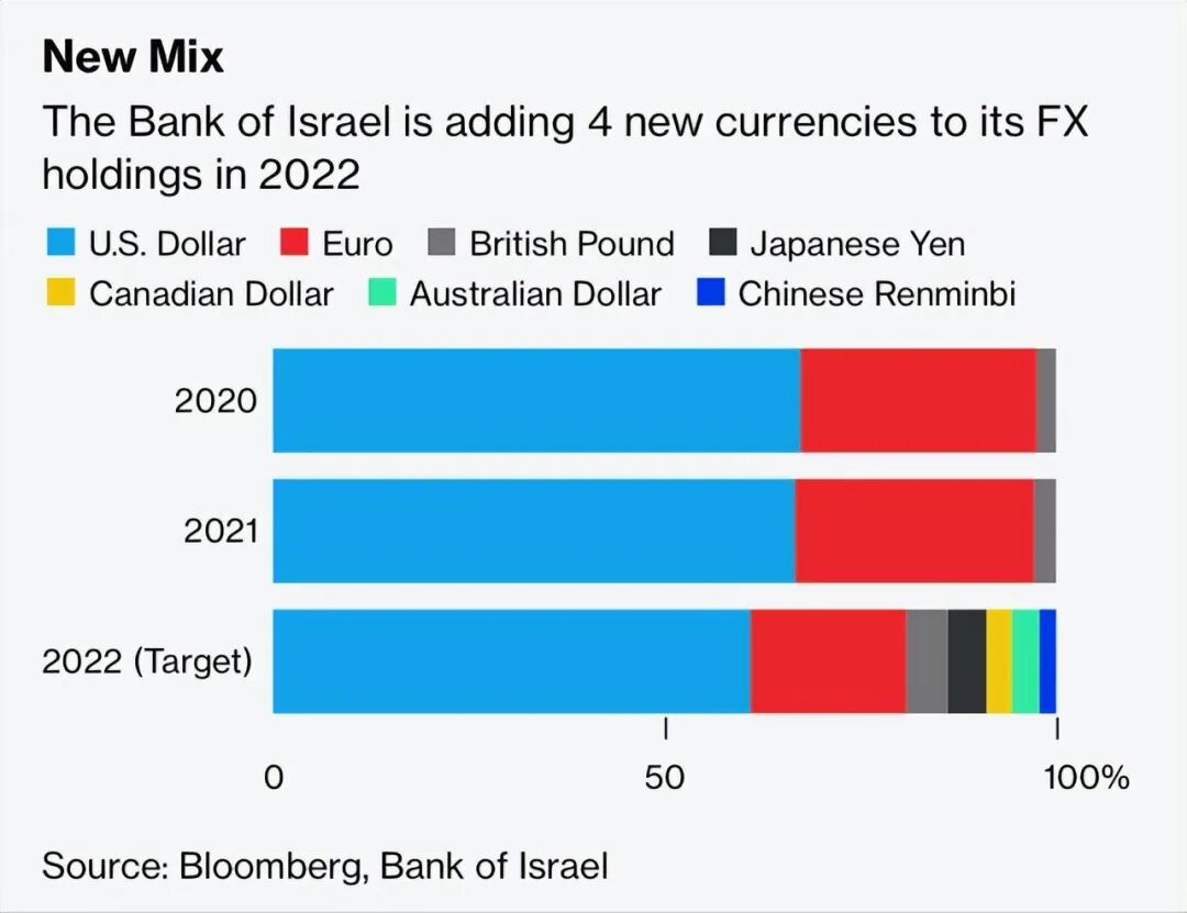 据国际货币基金组织在6月发布的报告称,以色列银行最近提出了一项超过2000亿美元储备的新战略,从2022年开始,将削减美元在投资组合中的份额,并加强对澳元、加元、人民币和日元的分配。