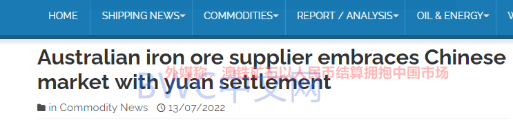 根据希腊航运网站7月13日称,澳大利亚铁矿石供应商以人民币结算拥抱中国市场。该网站援引澳铁矿石企业必和必拓的一份声明称,一艘装载来自西澳大利亚一个矿山的铁矿石的维多利亚号船已经抵达日照港。并且澳大利亚铁矿石集团必和必拓还庆祝了其第一批人民币现货铁矿石贸易运抵中国。