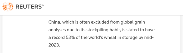 值得一提的是,美国金融网站Zerohedge7月17日进一步称,今年以来,到目前为止,只有俄罗斯和中国,这两个国家实现了小麦的大丰收。而在小麦储备层面,路透社分析师Karen Braun此前表示, 基于储存习惯而没有被全球分析师追踪到更多数据,但预计到 2023年年中,中国将拥有创纪录的53%的全球小麦库存 。