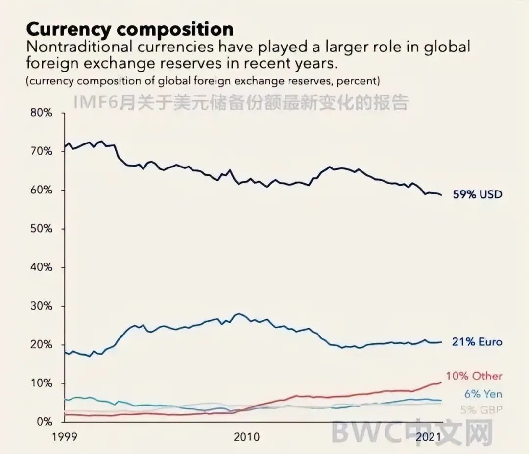 据IMF在7月公布的全球外储货币构成(COFER)数据显示,截至3月,美元在国际储备资产中的份额占比已经滑落到25年以来的最低值至58.8%(去年同期为59.43%),延续了二十多年以来的下跌趋势,如果按此趋势,我们很快就会看到这个数字接近50%,而2000年时该比例还高达73%,而从美元转移出来的四分之一份额已经转化为了人民币储备。