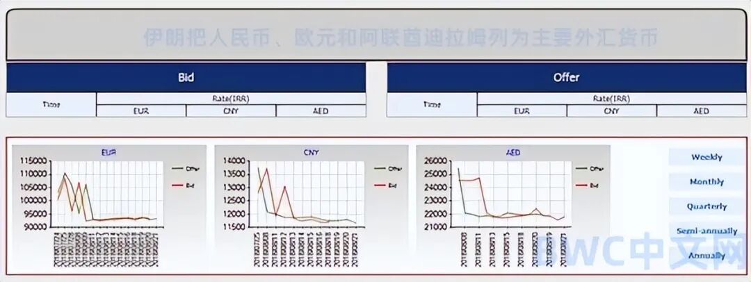 作为应对措施,伊朗当局已经开始在外汇领域改革创新,正式用人民币替代美元原来的外汇地位,并把人民币、欧元和迪拉姆并列为该国的三大外汇货币(具体细节请参考下图)。