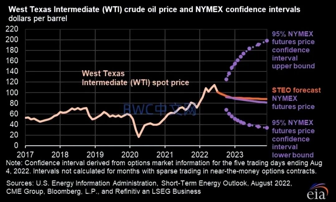 EIA的分析师说,在石油市场的高度波动和低流动性下,OPEC+如果减产,这可能会将油价推至每桶150美元(参考下图分析),这将会让美国通胀重新开始攀升,目前美国通胀仍高达8%以上,处于40年以来的高位。
