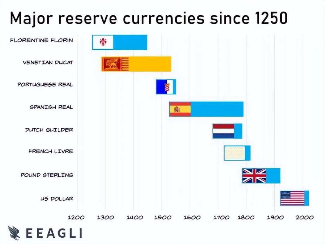 BWC中文网国际财经研究团队独家分析认为,从货币历史的角度来看,美元的主导地位已经存在一百多年来了,自15世纪以来,世界上最主要货币平均每94年就会换成另一种主要货币。