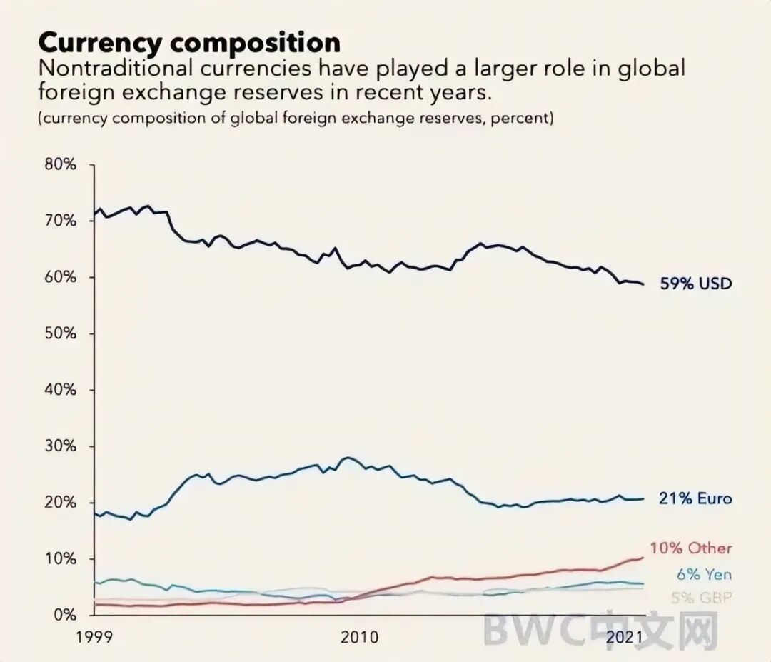 根据国际货币基金组织(IMF)最新数据, 目前美元在全球外汇储备中的份额为 59%,为1995 年以来的最低水平。一些经济体正在用其他货币替代美元之前的储备地位。2022年全球货币领域还发生了一件让市场更加意外的事。
