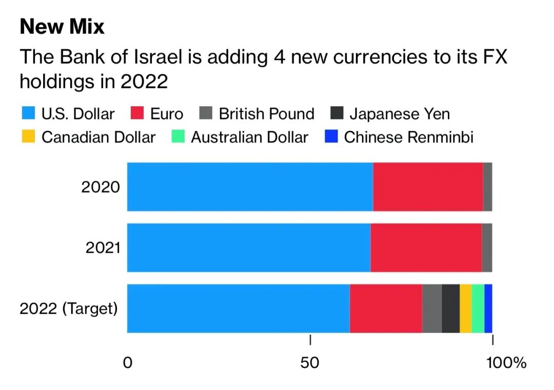 Zeroehedge稍早前称,以色列正在减少对美元的敞口,增加对人民币的敞口。以色列抛售美元储备换取人民币储备。在以色列外汇储备布局中,2022年人民币的比重定为2%。而美元的份额从 66.5% 下降到 61%。