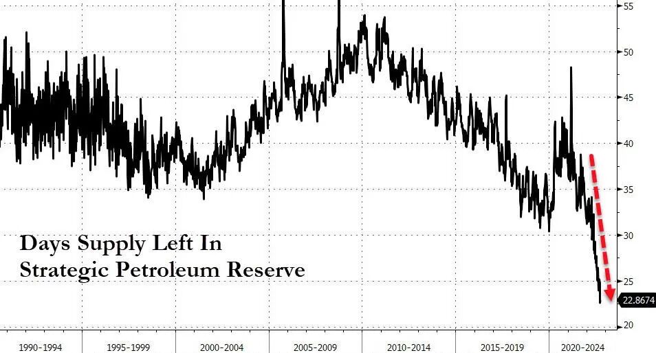 正如下图所示,全球原油价格的上涨开始对美国零售汽油价格带来新的压力,扭转了此前的下降势头,雪上加霜的是,目前美国的战略石油储备(SPR) 已经没有太多的释放空间了(仅能支持22天)。