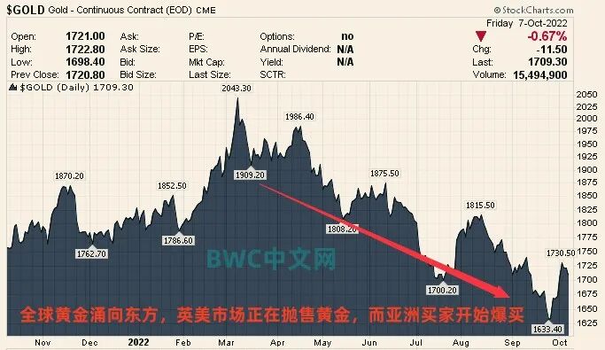 据芝加哥商品交易所集团和伦敦金银市场协会在10月9日公布数据显示,全球黄金正在涌向东方,英美市场正在抛售黄金,而亚洲买家开始大量的购买黄金,数据显示,自2022年4月底以来,纽约和伦敦两个最大的西方黄金市场中的黄金已经流出527吨黄金,创下近十年以来最快的下降速度。