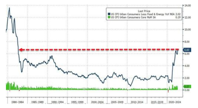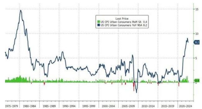 美国劳工部于美东时间10月13日公布的最新数据显示,美国9月CPI(消费者价格指数)环比上涨 0.4%(两倍预期),同比上涨 8.2%,高于 8.1% 的预期。依然是上世纪70年代和80年代初以来的最高水平。