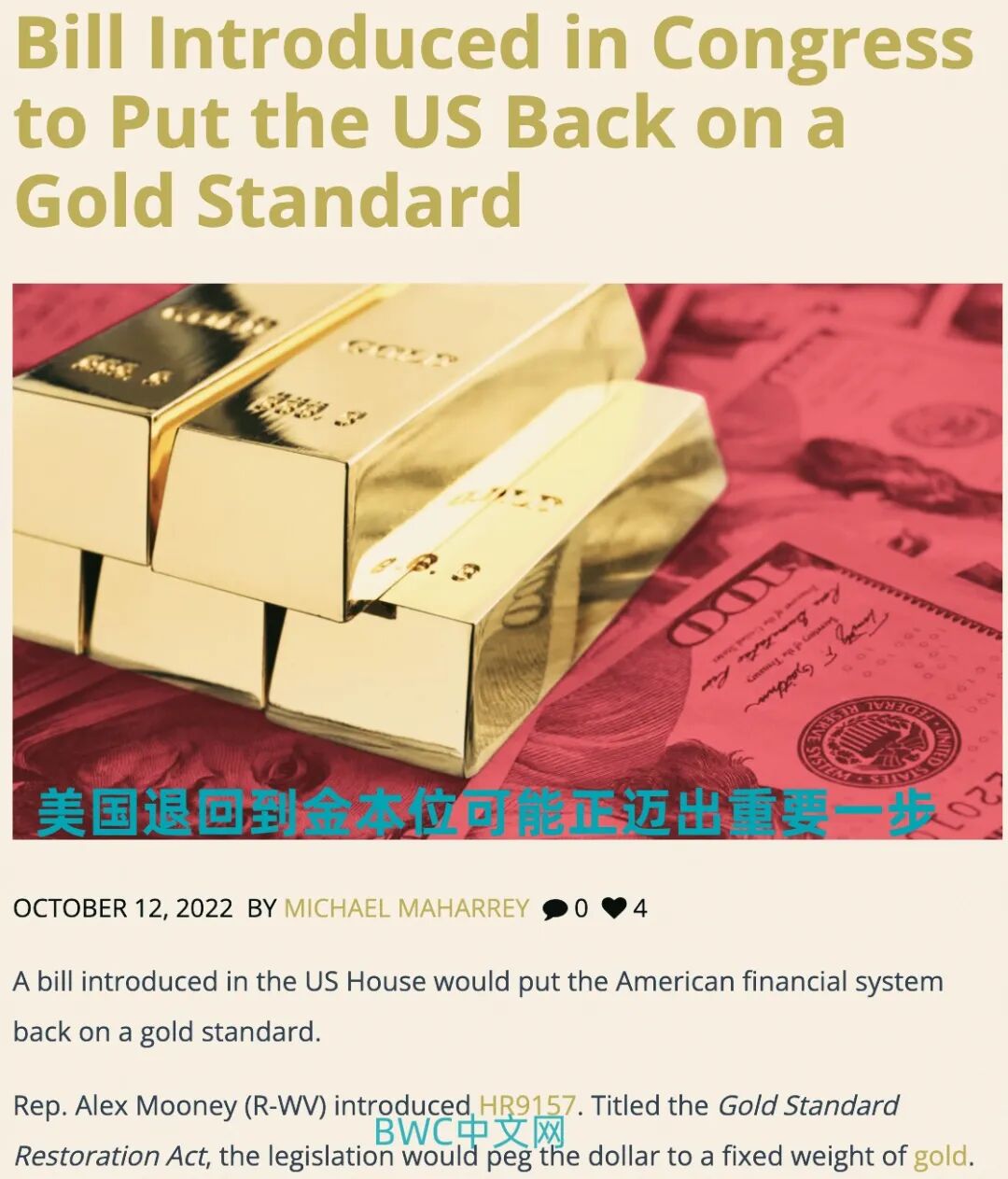 正是在这些背景下,美国意外地提出要让美元退回到金本位,据美国领先的贵金属研究机构Schiffgold在10月12日发表的一份报告中表示,美国众议员亚历克斯·穆尼(ALEX NOONEY)再次大胆地向众议院和美财政部提交了一项新提案(HR9157),解决办法是控制美联储的货币供应量,将黄金价值重新注入美元,并将其决定权交还给美国市场,让美元从目前锚定美债的方式重新回到金本位制标准,换句话说就是回到金本位制。