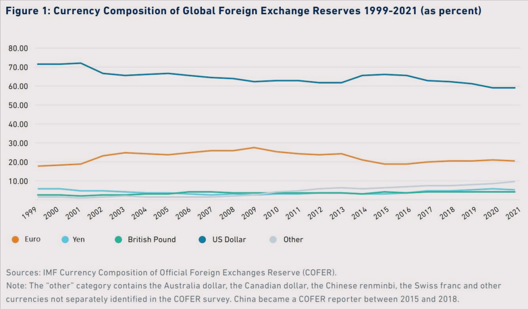 据IMF在10月公布的全球外汇储备数据显示,美元第二季度在全球外汇储备中的占比再次下降至58.9%,跌至25年以来的最低值,而2000年时该比例还高达73%(具体变化趋势请参考下图)。如果按照这个趋势,我们很快就会看到这个数字接近50%。