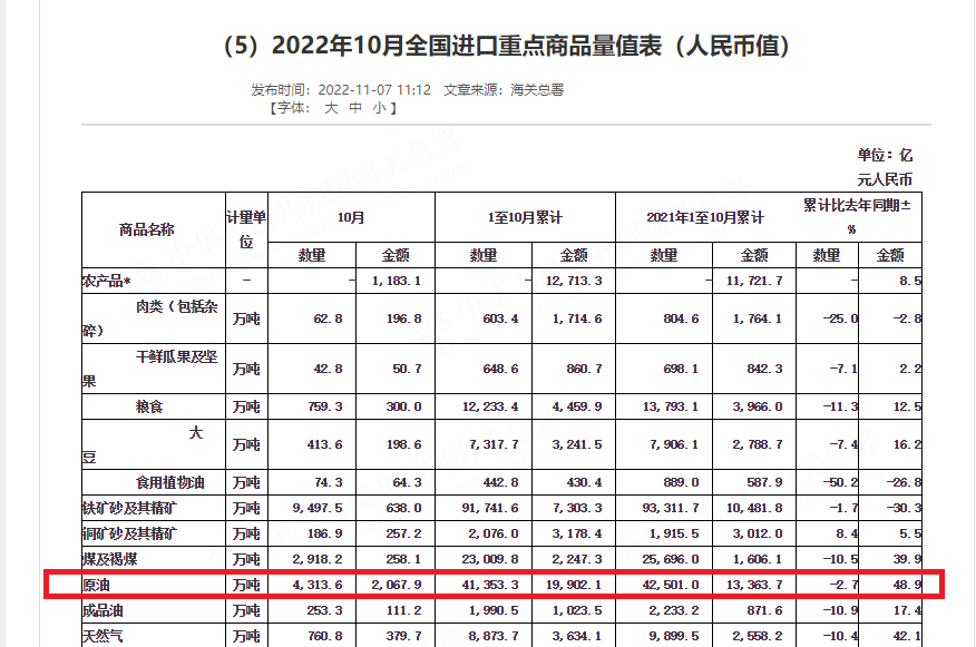 值得一的提的是,如上图,BWC中文网查询中国海关总署11月7日公布的最新数据显示,今年1-10月,中国进口原油超过4.1亿吨,也就是说,目前已知的,至少4.1亿吨原油运抵中国,对应金额为1.99万亿人民币。(完)