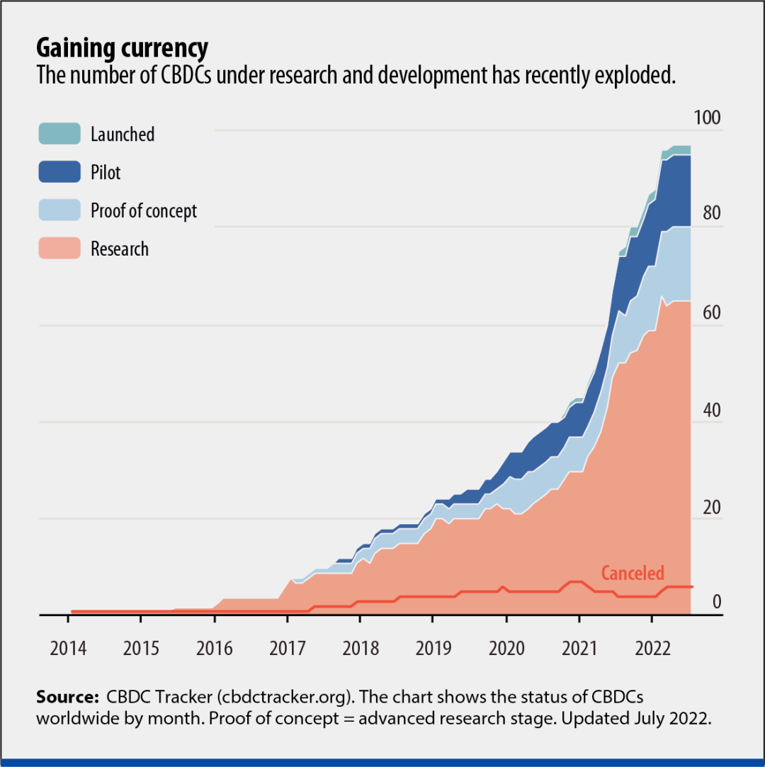 据IMF在12月4日最新发布的报告称,截至2022年11月,全球有124个货币当局正在进行数字货币的研究或开发阶段(其中两个已全面推出,尼日利亚的eNaira以及巴哈马沙元),正在探索其潜在好处,同时,CBDC还可以提高货币流动的透明度,并有助于减少美元的储备(当一个国家在外币之外使用或代替本国货币时)。