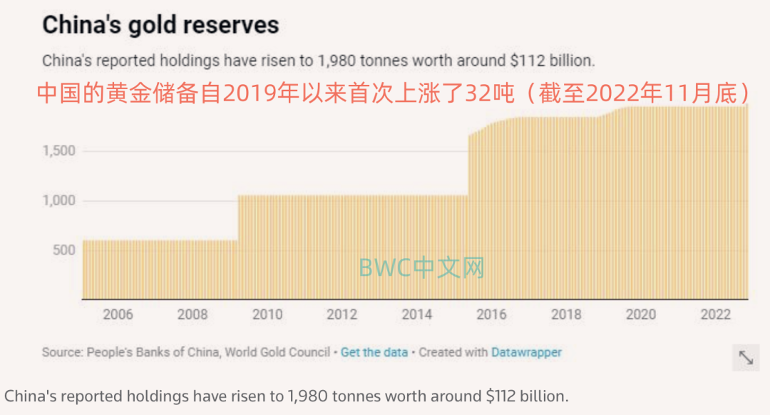 第一件事是,中国在时隔三年后,首次增加了官方黄金储备,据国家外汇管理局在12月7日数据,中国11月末黄金储备报6367万盎司,相较10月末增加了103万盎司,约32吨,这意味着中国公开的官方黄金储备已经增加至1980吨,超出市场预料之外,中国拥有仅次于俄罗斯、德国和美国在内的世界第六大官方黄金储备,美国拥有量最大,约为8,133.5吨。