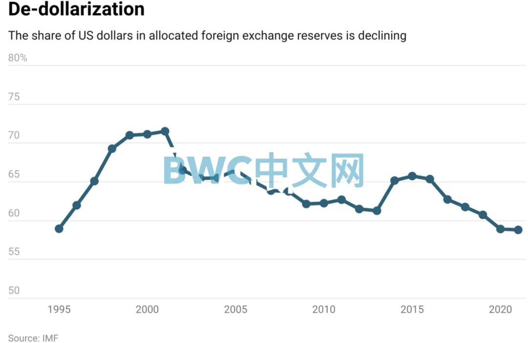 与此同时进行的是,现在也出现了越来越多有关数字货币去美元中心化的声音,这种冲击波可能在接下去以相同形式发挥其影响,甚至连欧盟也要抛弃石油美元结算的背景下,其储备份额更会出现下降,具体请参考下图:美元在全球储备份额中占比趋势变化。