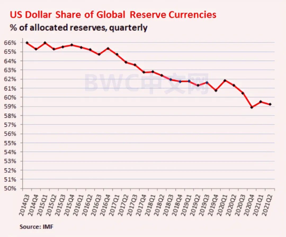 据SWIFT在11月30日公布的数据,10月,美元的国际支付比例由9月的39.45%降至39.16%,连续三个月下降,而今年5月,欧元更是反超美元,成为国际支付占比最高的货币,另外,IMF的最新数据也显示美元份额在2021年第二季度意外下降至25年以来最低值至59.34%,请注意,11年前美元该比例还高达73%。