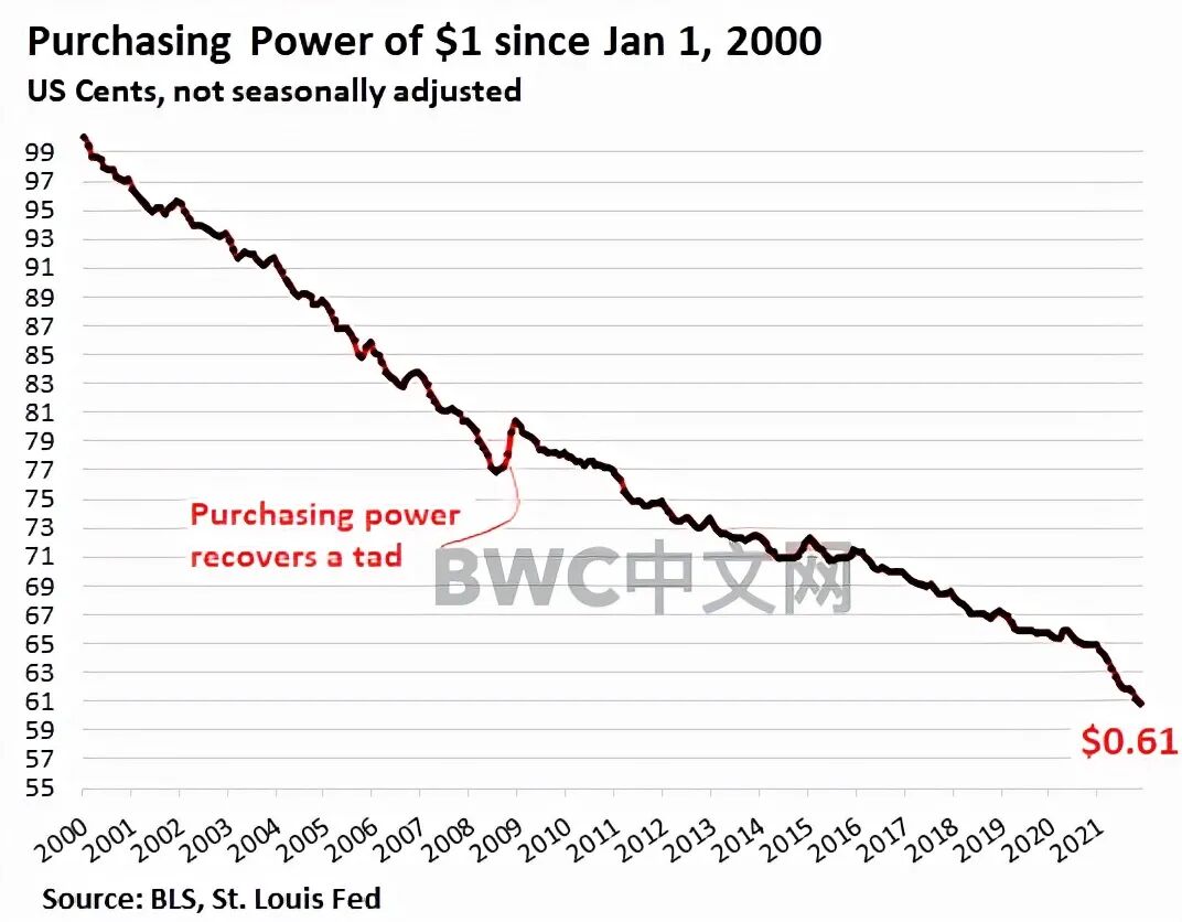 另一个因素是,美国议员亚历克斯穆尼一周前向美财政部提交的有关敦促美联储应恢复金本位的方案中提到,自1913年以来美元已经丧失了96%的价值,几乎平均每过一代人就会损失掉50%的购买力,正如下图数据所示,在持续的高通胀下美元的购买力迅速下降。