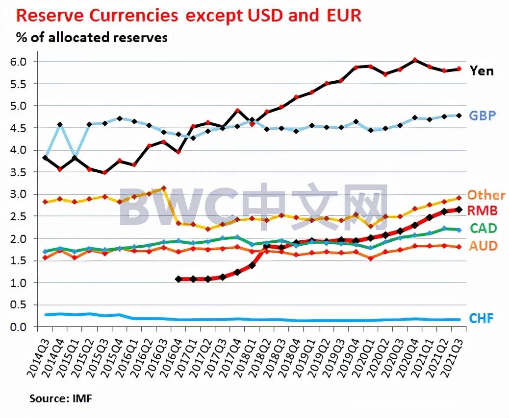 值得一提的是,人民币的占比实现连续9个季度的增长至2.45%,创下IMF有该项数据记录以来的新高,而按过去36个月内保持增长0.36%的速度,人民币所占比重上升了154个百分点,按照这个速度,人民币将在50年后达到25%的份额(具体数据细节趋势请参考下图)。