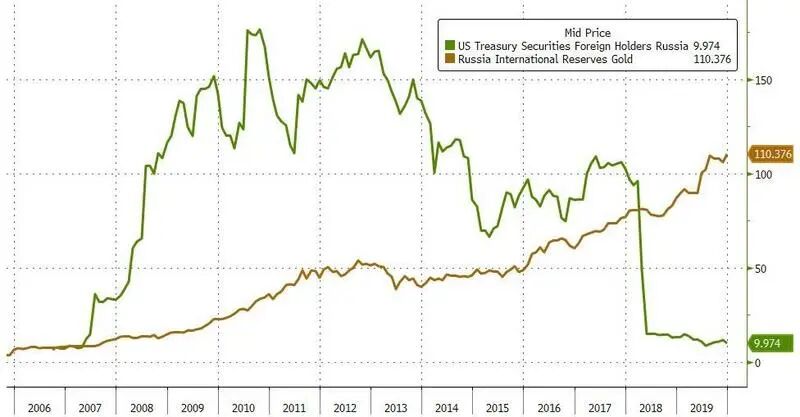 事实上,几周前它可能已经达到了一个重要的里程碑:根据彭博社分析俄罗斯中央银行在1月份发布的一份报告,去年,该国央行的黄金持有量首次超过其美元储备,黄金占总储备的23%,美元资产跌至22%,而美债更是持仓降至20亿美元,正在以清仓式的速度在重手抛售,此消彼长,人民币比例被提至30.4%。