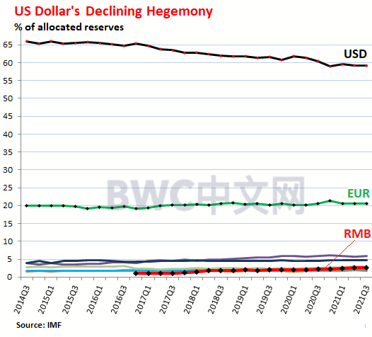 据IMF在1月份公布的数据显示美元份额在2021年度意外下降至25年以来最低至59.3%(具体数据细节趋势请参考下图),请注意,2000年时该比例还曾高达73%,因为当美国通货膨胀肆虐时,美联储可能会失去对通胀的控制,这也使得外国央行开始抛售以美元计价的资产,美元份额暴跌。