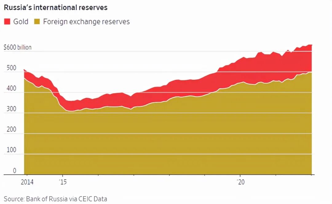 据俄罗斯央行在2月16日公布的数据,得益于能源价格大幅上涨,截至2月初,俄罗斯拥有近6,350亿美元的黄金和外汇储备,接近历史高点。