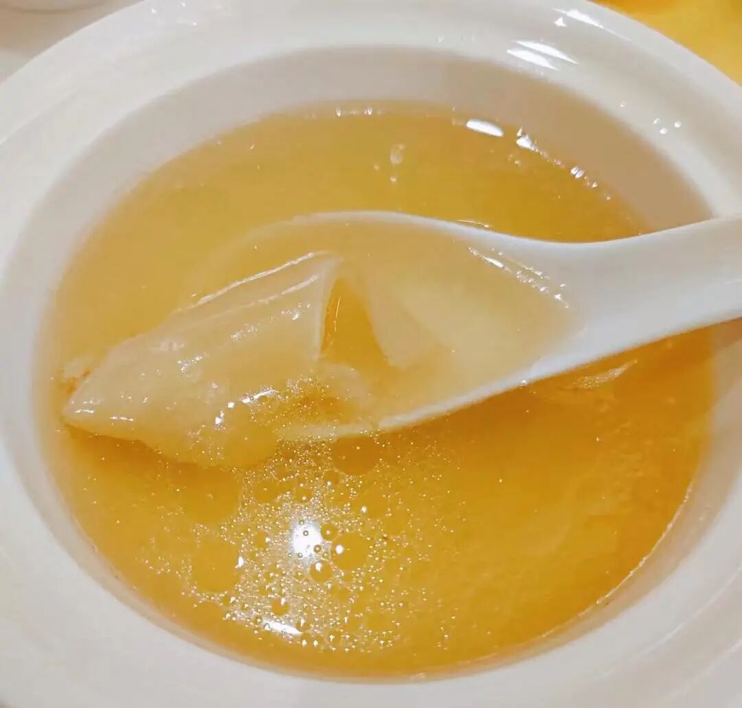 这是一道汤菜,但是跟山东不一样的是,这边是每个人一小碗,而不是一大碗放在桌上,汤汁色泽金黄,花胶晶莹剔透,看着就是一道很不错的滋补汤品。