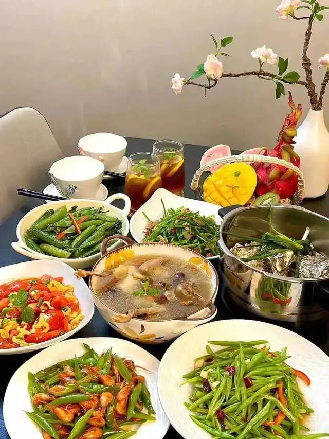 每顿有荤有素有汤,这样的饭菜不仅颜值高,看着就让人很有食欲,不愧是家里有矿的人,还是广东人会吃啊。