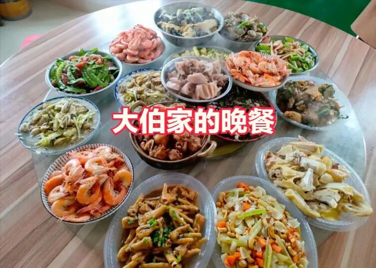 二人来到大伯家,伯母已经准备了一大桌丰富的饭菜,有大家爱吃的白灼虾,有卤鸡爪,有红烧猪蹄,有白切鸡,有荷兰豆炒广式香肠,有爆炒花蛤,有莲藕炖排骨等20道菜品。