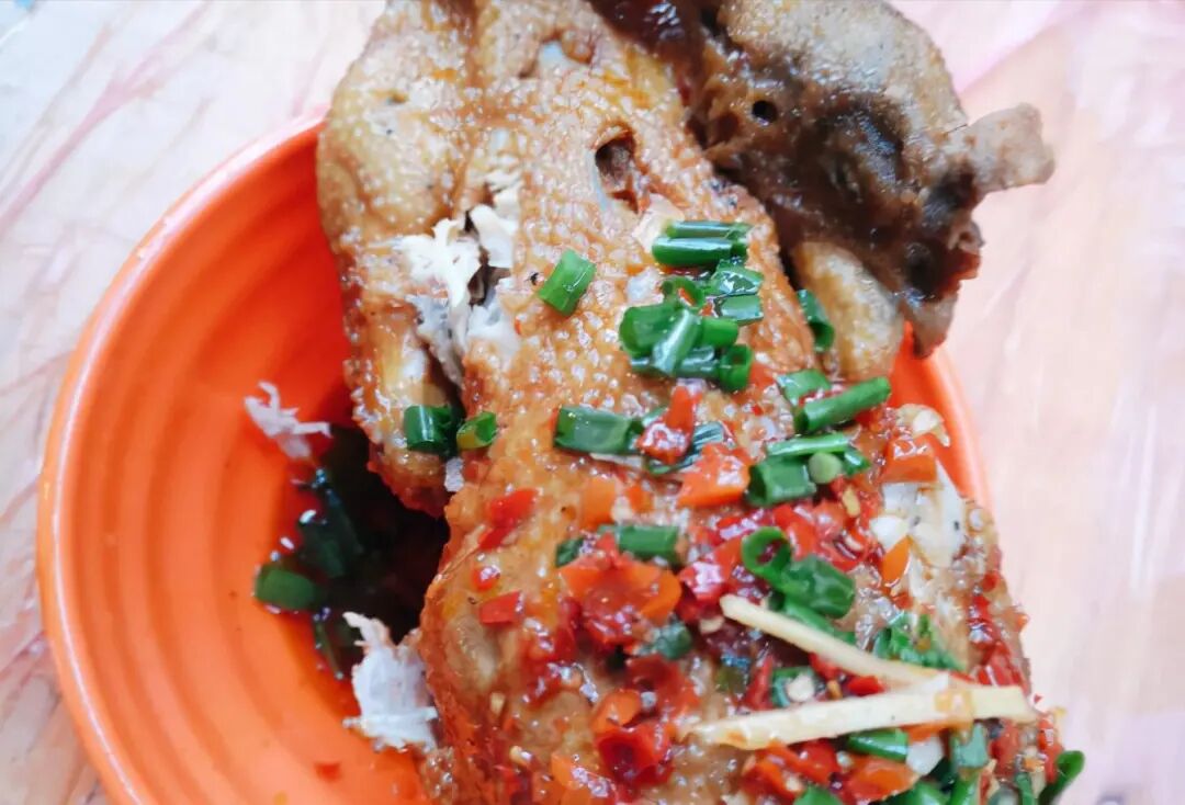 鸡肉上面放了很多的剁椒,碗底还有一点酱油,同桌的年轻人已经开始食指大动地吃了起来,只见同桌的年轻人将筷子插入这只鸡的腹部,然后另外一个年轻人直接用筷子帮忙分肉,夹起到鸡肉后,放入酱油汁中,蘸酱之后再放入嘴里吃了起来。