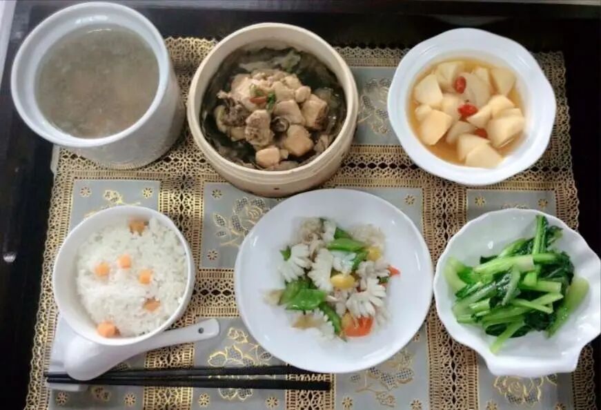 周一午餐菜品:海参小米粥+枸杞冬瓜排骨汤+炒黑木耳+豆角丝+山药焖羊排+紫米饭。