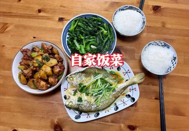 刘秋玲自家周一的晚餐:土豆烧鸡+清蒸黄鱼鲞+清炒菜心。