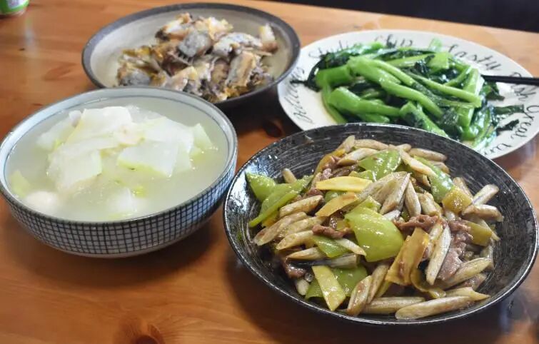 刘秋玲和丈夫二人,晚餐吃3菜一汤,有带鱼有牛肉有菜心还有冬瓜汤,这样的饭菜已经算是非常丰盛了。