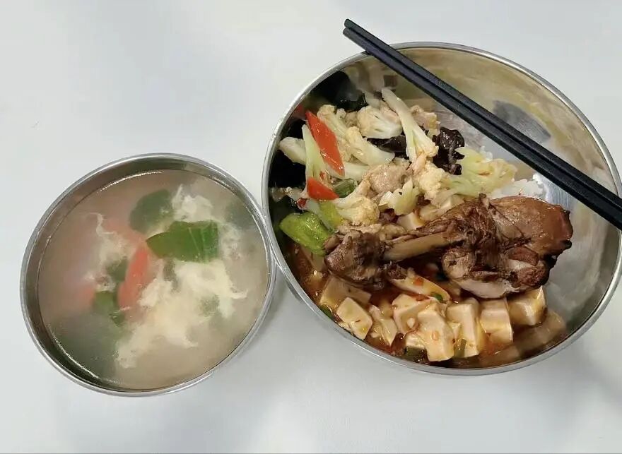 周三午餐:卤鸡腿+烧豆腐+花菜+西红柿鸡蛋汤。