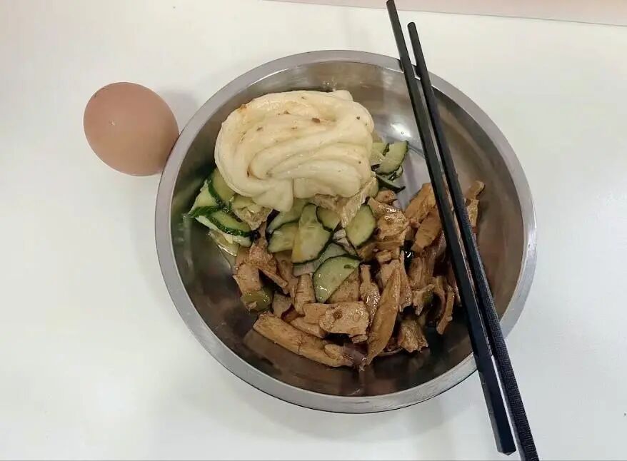现实中的食堂伙食吃得比广东还清淡,一碗小米粥,一份土豆丝还有一点黄瓜片,何翔宇曾经想象中的大口吃肉并没有出现,反而比在广东老家吃的更素了。