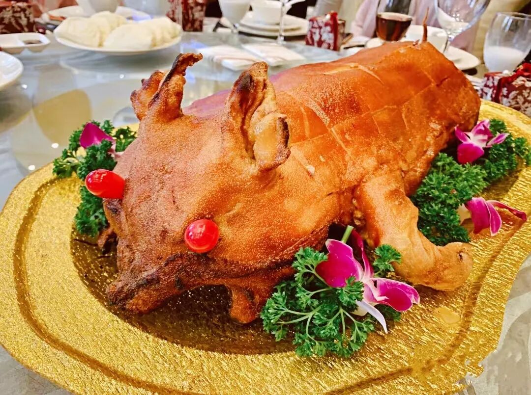烤乳猪的两个眼睛被小番茄给遮住了,金黄色的猪身上,已经被厨师用刀切好了,食客们只需拿起筷子,夹起烤乳猪大口品尝即可。