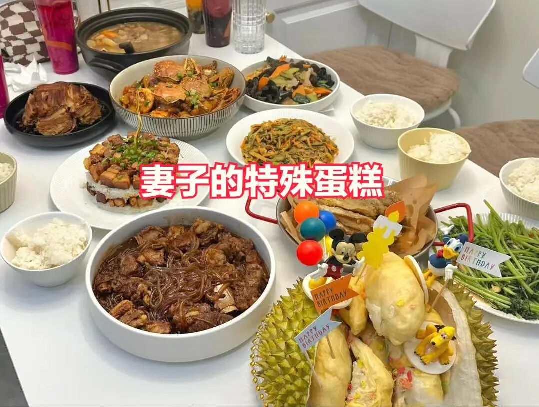 妻子下班回来,看到张辉鹏做的一桌生日饭菜,还有正中间放着的“五花肉蛋糕”很是感动,没想到平时粗枝大叶的丈夫,也有浪漫的一面。